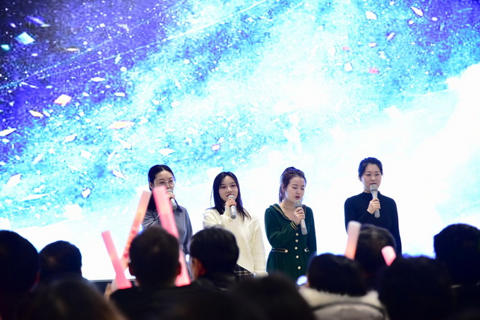 联欢会由王丽琨、孟得媛、要家威、杜明硕四位师生组成,青春靓丽的主持人一亮相就得到了满堂掌声。他们用或热情洋溢,或诙谐幽默的串场词为整场联欢会增光添彩,现场气氛热烈。开始一首合唱《我和我的祖国》点燃了大家的热情,大家都跟着音乐一起合唱,唱出对祖国的热爱与祝福。紧接着的配乐诗歌朗诵《新年你好》更是给大家带来了新年的祝福。歌曲《小幸运》更是掀起了一阵高潮,大家挥舞荧光棒,享受这欢聚一堂的幸运。联欢会中为观众带来欢乐最多的要属相声《我太难了》和小品《毕业论文离奇事件》幽默风趣的语言、诙谐逗趣的表现,让现场的观众掌声笑声不断。留学生的节目也很是出彩,他们的歌曲串烧英文歌曲《queen of my heart》和中文歌《因为刚好遇见你》让我们看到留学生的风采,想必他们在我们中心也体会到家一样的温暖。此外歌曲《天天向上》、《我和2035有个约》、《我们都是追梦人》都展现了青年一代的责任和抱负,展现祖国的未来由我们来创造的决心。配乐诗朗诵《相信未来》和《祖国,我亲爱的祖国》表达了对未来的期望和对祖国的热爱。学生舞蹈《礼仪之邦》将中国传统礼仪运用舞蹈的展现形式展现出来,不仅给我们带来了美的体验更是让我们了解了中国的传统礼仪文化。由中心妇委会带来的蒙古舞《可能否》更是展现了中心职工和学生不一样的风采。精彩的武术表演《武动青春》与诙谐的表演相结合,燃爆全场,让观众体验到传统武术的那份魅力。此次联欢会还设有两个游戏环节,现场观众积极参加,配合默契,体会到游戏的乐趣。