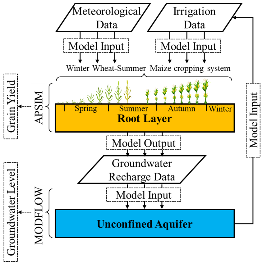 中国科学院农业资源研究中心沈彦军研究组选取子牙河流域平原区为研究区,发展了APSIM-MODLFOW耦合模型框架(图1),耦合模型研究结果显示:在全部雨养或小麦1水(单次灌溉量:70 mm/亩)、玉米雨养灌溉的条件下,区域平均浅层地下水水位呈现回升趋势;随着小麦玉米灌溉次数的增加,区域平均浅层地下水呈现下降趋势且下降速率增大;在小麦玉米农田1-2次灌溉、总灌溉量70-140 mm的条件下,区域浅层地下水可实现整体采补平衡。该研究所创建APSIM-MODFLOW耦合模型框架可有效模拟区域尺度作物产量与地下水位变化,关于灌溉制度对区域尺度地下水位的影响机制的结论可对华北地下水超采治理的科学决策提供理论支撑。