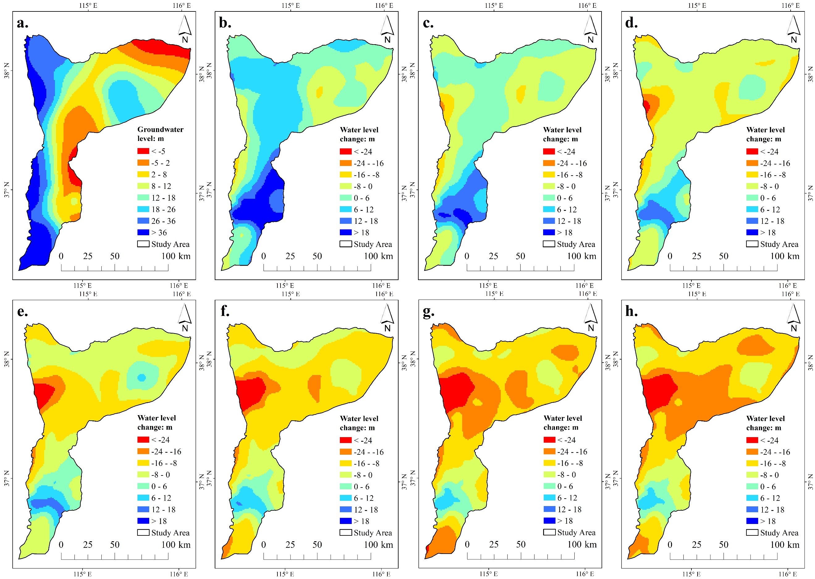 图2不同灌溉次数条件下子牙河流域平原区浅层地下水位变幅:(a)初始地下水位分布, (b)雨养条件地下水位变幅,(c)1水灌溉条件地下水位变幅,(d)2水灌溉条件地下水位变幅,(e)3水灌溉条件地下水位变幅,(f)4水灌溉条件地下水位变幅,(g)5水灌溉条件地下水位变幅,(h)充分灌溉条件地下水位变幅