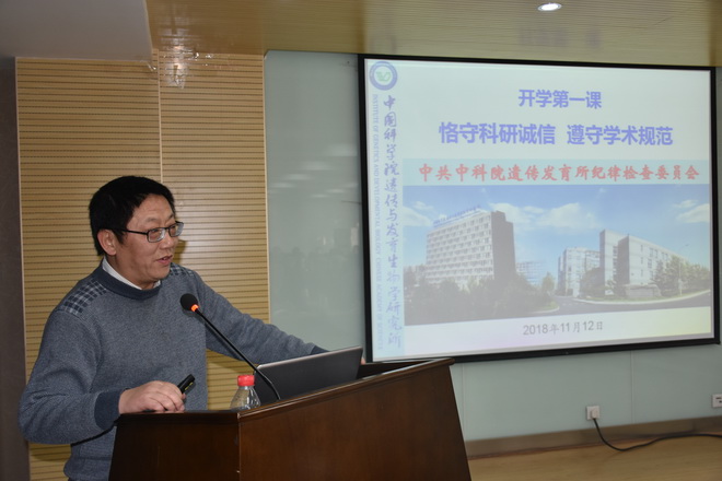 11月12日,农业资源研究中心举办了“国农论坛”2018年度第23讲“恪守科研道德 遵守学术规范”主题报告会。中国科学院遗传与发育生物学研究所纪委委员、中国科学院人才计划研究员、国家杰出青年基金获得者左建儒研究员受邀作了主题报告。受中心党委委托,中心党委委员、植物遗传与育种研究室主任刘西岗研究员主持了报告会,中心80余名师生参加了会议。