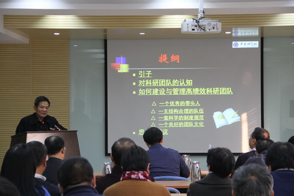 郭传杰研究员先后介绍了科研团队的组织形式、分类、结构、特点和行为曲线以及团队力量的源泉分析。他认为,优秀的团队应具备优秀的带头人、结构合理的队伍、沟通顺畅、信息共享、有约束与激励机制且有共享的愿景和目标。而认识不到位、利益冲突、体制机制不顺是影响团队建设的误区和障碍。