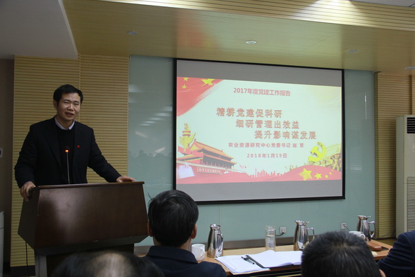 中心党委书记赵军代表中心党委作了“精耕党建促科研,细研管理出效益,提升影响谋发展”的党建工作报告。报告从履行党建工作责任情况及效果、学习宣传贯彻习近平新时代中国特色社会主义思想和党的十九大精神情况及效果、推进“两学一做”学习教育常态化制度化情况及效果、抓基础性工作情况及效果、抓党风廉政建设和反腐败工作情况及效果、以党建促管理工作情况、推动科技智库和宣传工作成效、创新文化建设等十个方面阐述了中心党委2017年认真履行全面从严治党职责,带头增强“四个意识”、坚定“四个自信”、做到“四个服从”,在政治立场、政治方向、政治原则、政治道路上自觉同以习近平同志为核心的党中央保持高度一致,坚决服从中科院党组和河北省委领导,坚定不移地把党中央、中科院党组和省委各项决策部署落到实处,带领中心全体党员开创党建工作新局面的主要工作,并提出了下一步的工作设想。赵军表示,2018年,中心党委将带领中心广大党员干部群众紧密团结在以习近平同志为核心的党中央周围,以十九大精神为主线,牢固树立“四个意识”,坚定不移维护党中央权威和党中央集中统一领导,继续努力探索党建促科研的有效途径,为中心打造“率先行动”计划升级版、践行十九大精神贡献力量。