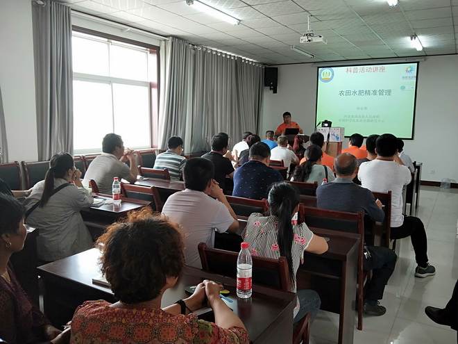 活动中,农业资源研究中心青年研究员、南皮站副站长、渤海粮仓科技示范工程主要参与人孙宏勇老师以“农田水肥精准管理”为题,根据南皮县农田生态环境特征,讲述了如何选择良种、确定播期、精准灌溉、精准管理等农业种植相关内容。讲解完毕,孙宏勇研究员引导大家参观了南皮站的相关实验,并介绍了试验站在中低产田改良和“渤海粮仓”工作中所做的品种选育、盐碱地改良、抗旱节水技术、多水源高效利用与咸水灌溉等相关内容的试验原理和结果。活动期间还为参与本次活动的种粮大户发放了农村科技口袋书——《渤海粮仓增产增效新技术》。