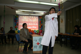 激情四射,动感十足的开场舞《para para sakura》拉开了元旦晚会的帷幕,首先由中心主任马七军致开幕辞,热情洋溢的总结过去,展望未来,并为同学和老师们送上了新年的祝福。本次联欢会精彩纷呈,各具特色的节目自始至终展现着学生们积极向上,乐于进取的风采。一曲诙谐幽默的《猪头哥哥》将大家带进欢乐的海洋,随后的琵琶独奏又让人领略高雅,《忘情水》唱出了男生的柔情,赵化田及其开山弟子李玉欣的双节棍表演引起大家一阵阵的惊叹,胡春胜老师课题组献上的《相亲相爱》让大家共鸣,搞笑夸张的小品《心理医生》与口琴独奏《友谊天长地久》将晚会推向高潮,老师们优雅的舞姿和淳厚的歌声让人久久难忘,神秘嘉宾马龙的魔术表演、刘悦琳的小提琴演奏更是锦上添,2007级全体同学的《明天会更好》唱出了大家的心声…