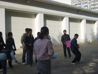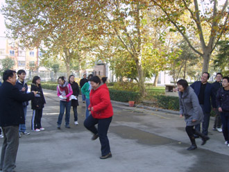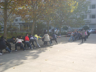 早上八点半,运动场上人头攒动,大家抓紧时间厉兵秣马:踢毽子、跳绳,作赛前准备。八点五十分运动会正式开始,首先进行的是“篮球保龄球”即以篮球作保龄球,矿泉水瓶作保龄球瓶,踢球撞击水瓶,紧接着是跳大绳、“毽子比赛”、“瞎子敲锣”、“背筐接球”、“击球进筐”、“脚夹球接力跑”,领导、老师和同学们你争我夺、配合默契,玩得不亦乐乎,运动会在欢声笑语中进行。最后以男女混编的拔河比赛将运动会推向高潮。整个运动会趣味洋溢,组织井然,大家的参与热情高涨。