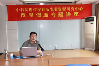 为加强中心党风廉政建设和反腐倡廉工作,切实保障改革创新发展,推进创新2020规划方案的顺利实施,农业资源研究中心于2011年7月12日邀请中科院监察审计局郭建军副局长来中心做了题为“加强反腐倡廉建设 预防职务犯罪”的专题讲座。中心领导、党委委员、纪检小组成员、部门负责人、课题组长及党员等参加了专题讲座。会议由韩一波书记主持。