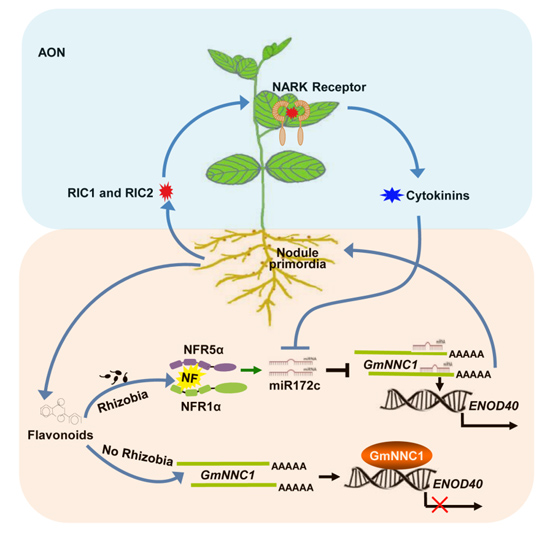中国科学院遗传与发育生物学研究所农业资源研究中心李霞课题组研究证明,在没有根瘤菌的情况下,大豆转录抑制子Nodule Number Control 1(GmNNC1)与结瘤调控因子ENOD40基因的启动子结合,抑制其表达;当根瘤菌侵染大豆根系时,诱导microRNA172c(miR172c)表达,miR172c进而通过剪切GmNNC1 mRNA减少GmNNC1的蛋白量,去除了转录抑制子GmNNC1对ENOD40的抑制;使得EOND40进一步激活了结瘤因子诱导的信号转导途径,从而启动了根瘤的发生发育。同时证明了抑制大豆超结瘤的自主调控途径(AON:Autoregulation)可通过Shoot-derived inhibitor如细胞分裂素来抑制miR172c的表达,从而避免大豆过度结瘤。
