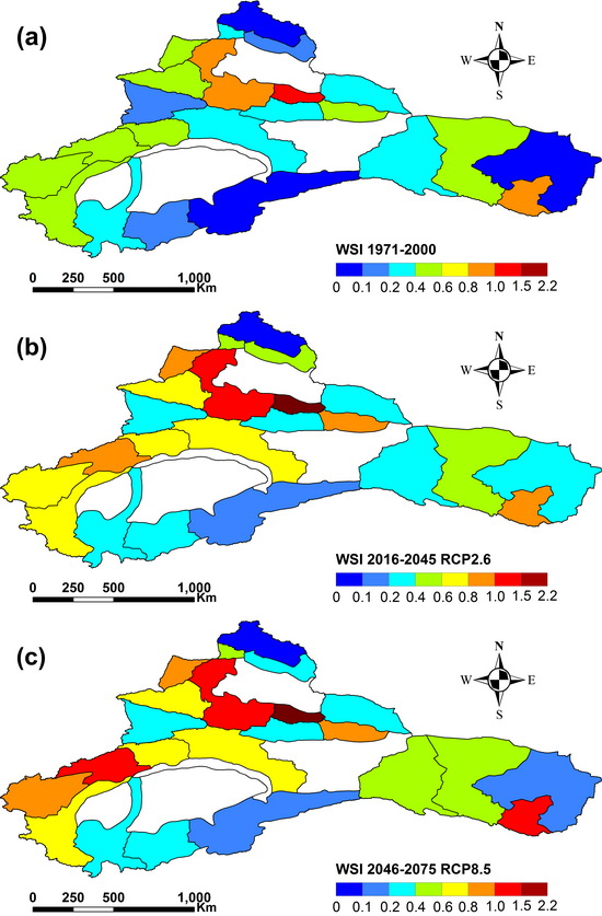 图2 西北干旱区各流域(a)1971-2000年历史时段与(b)低排放情景2016-2045年时段及(c)高排放情景2046-2075年时段的缺水指数对比