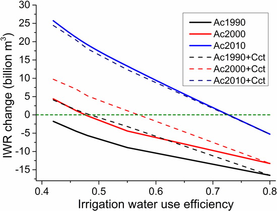 图3 三种应对措施下的未来灌溉需水量相对于历史时段的变化(灌溉水利用效率分别为0.42、0.48、0.52、0.68和0.8,作物面积Ac分别为1990年的2.7×106hm2、2000年的3.0×106hm2和2010年的4.4×106hm2,Cct表示作物结构调整为北疆和河西地区全部种春玉米,南疆全部种棉花。实线表示未考虑作物结构的调整,虚线表示考虑了作物结构的调整)