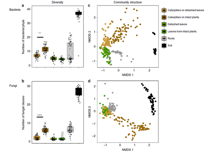 研究人员首先发现,当只被允许取食植物叶片时,昆虫体内微生物群落结构非常简单。然而,当为昆虫提供整株盆栽植物取食时,昆虫体内微生物与土壤微生物群落结构惊人的相似,重叠率高达75%。这也推翻了该研究最初的假设,即植物微生物组与植食昆虫体内微生物组是最为相关的。