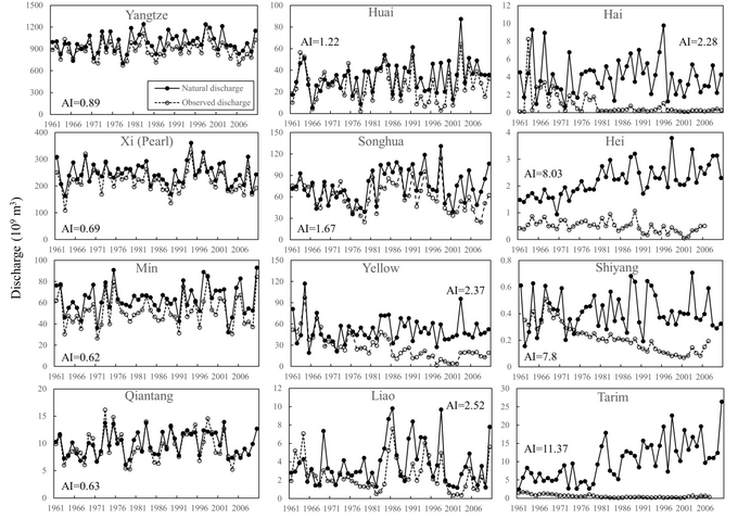 杨永辉课题组周新尧博士通过重建我国12大流域上下游37个子流域的天然径流量并与实际观测径流对比,分析了我国近50年来地表水资源演变趋势,量化了上游用水对下游地表水资源的影响。研究发现,过去50年来我国地表水资源消耗量增加了约1.6倍,其中用水增加的65%发生在黄河以北的流域。地表水资源消耗量的增加使得全国地表水资源开发利用率从10%增加到18%,年人均地表水资源量从1500立方米下降到1200立方米。其中不同流域地表水资源开发利用率的变幅不同:湿润流域在20%以下波动;干旱流域从70%左右上升到90%左右,2000年代之后开始小幅下降;半湿润半干旱流域地表水资源开发利用率增幅最大,如松花江从14%上升到55%,黄河从30%上升到70%。