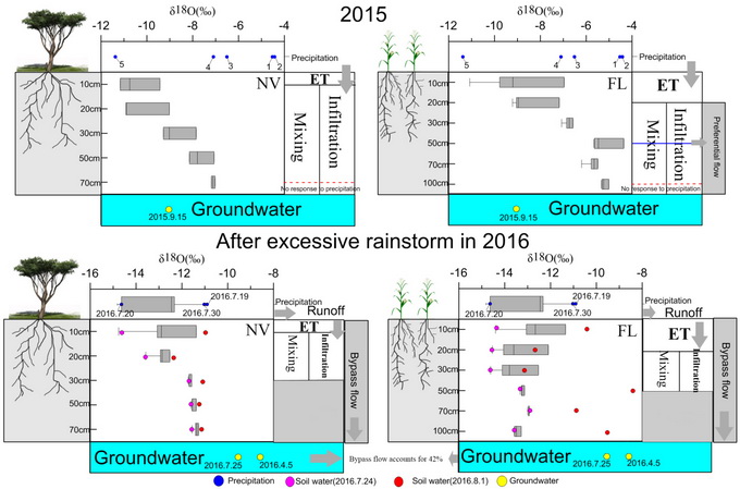 王仕琴课题组郑文波博士利用稳定同位素示踪技术揭示了极端降水和土地利用对太行山低山丘陵区典型流域土壤水分运动方式和地下水补给机制的影响。通过对比分析平水年份和丰水年(极端降水)降水补给地下水过程中同位素分布,研究发现,平水年连续降水后,降水仅影响自然植被和农田包气带表层土壤(0~30cm),深层土壤水和地下水对降水响应不显著,平水年无大暴雨时降水主要以“活塞流”的方式补给地下水;水文条件的改变是土壤水分运动方式改变的主要因素,丰水年极端降水后,降水补给地下水过程从“活塞流”转变为“活塞流”和“bypass flow”(优先流)方式,农田耕作、土石“二元结构”等条件促进了“优先流”的发生,研究表明丰水年极端降水后降水以“bypass flow”形式补给地下水比例达到42%。