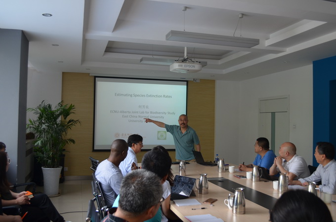 交流期间,何芳良教授以“Estimating species extinction rates”为题作了学术报告。这是中心“国农论坛”2019年度第9讲报告。报告首先介绍了因栖息地丧失而导致的物种灭绝速率的估算问题,由于没有普遍接受的估算方法和缺乏可靠的验证数据而导致不同研究结果存在很大争议;传统的物种面积关系估算方法(SAR)过高估计问题和修订过程,并从灭绝债务角度出发介绍了物种濒临灭绝速率的估算方法;最后介绍了物种灭绝的风险评估。报告后,与会科研人员和研究生就感兴趣的问题与何芳良教授进行了更加广泛而深入的学术交流。