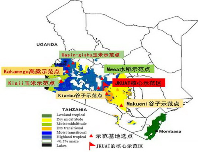 近年来,农业资源研究中心作为中-非联合研究中心核心参与单位,针对肯尼亚半干旱地区作物产量较低和土壤退化严重等现状,开展了主要作物品种筛选与土壤改良、秸秆培肥、集雨和排水等现代农业技术模式的集成示范。在JKUAT校区,建立了作物高产技术集成研究与展示综合试验基地,开展了不同作物品种引进和筛选与土壤改良、秸秆培肥、地膜覆盖、集雨和排水等现代农业技术的集成示范。并依托肯尼亚农业技术推广中心与典型农场,在不同生态类型建立了示范网络,开展技术展示、培训、田间观摩,将新品种、新技术直接推广到了农业技术人员与农户。