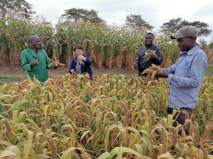 筛选的张杂谷系列杂交谷子在肯尼亚种植获得成功,今年在JKUAT示范基地和Kiboko国际半干旱地区热带作物研究所试验基地长势表现良好,与当地品种相比,产量高、生育期短、耐旱性更强。其中某杂交谷子品种在Kiambu郡的“农民日”田间展示活动上备受当地农民青睐。