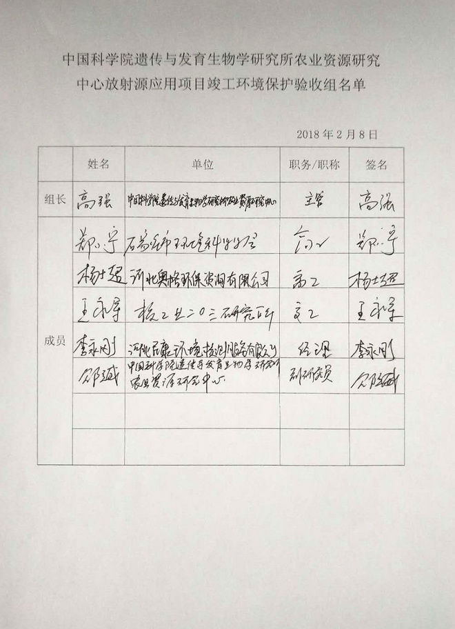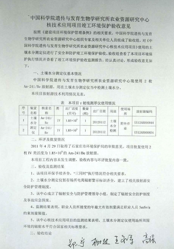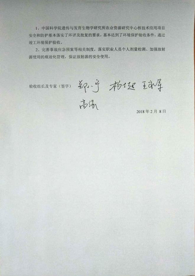 中科院遗传发育所农业资源研究中心核技术应用项目竣工环境保护验收意见