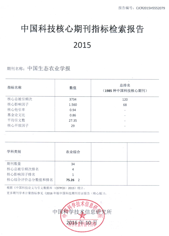 据中国科学技术信息研究所最新公布的期刊引证数据,《中国生态农业学报》2015年核心影响因子为1.560,核心总被引频次为3734,核心综合评价总分为75.26,均比2014年明显增加。34种农业综合类期刊中,核心影响因子排名第1,综合评价总分排名第2,总被引频次排名第4。1985种中国科技核心期刊中,总被引频次、影响因子和综合评价总分分别排名120、68和102。感谢各位读者、作者、专家的支持!