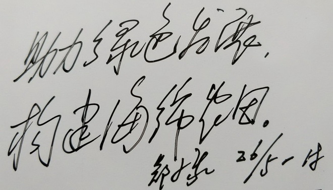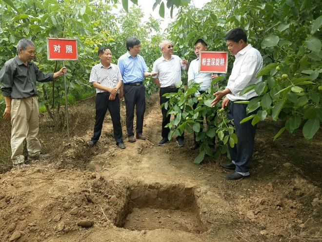 通过对不施肥处理,粉垄深旋耕后两年第四季作物-小麦和普通旋耕小麦试验地小麦生长状况和土壤剖面观测,郧文聚一行观摩了粉垄深旋耕不灌溉、灌溉1水(拔节期)、灌溉两水(拔节期,开花期),不同施肥水平处理的试验小区;粉垄深旋耕两年三季作物产量、水分利用效率、氮偏生产力,每亩纯收入比较汇总展板;到天亮合作社进行了粉垄深旋耕核桃示范基地观摩。在看到和了解到粉垄深旋耕在华北平原小麦、玉米、谷子、核桃等作物中,可以明显打破犁底层(深松土壤达45公分)、改良土壤结构、节水节肥、增产增效的结果后,郧文聚副主任高度肯定了农业资源中心研究成果,欣然现场题词:“助力绿色发展,构建海绵农田”,并写小诗一首“百闻不如一见,卅年僵层打散。独创粉垄绝技,构建海绵农田”。
