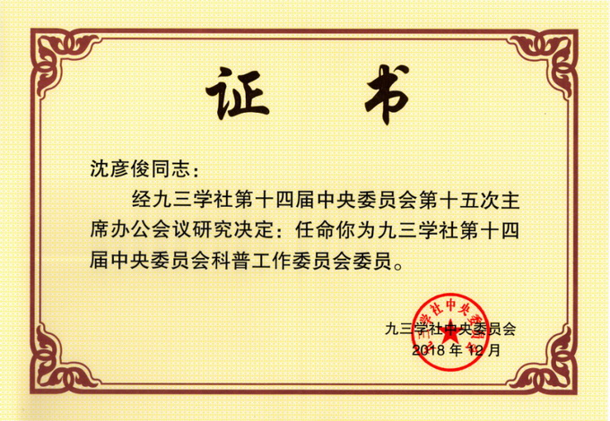 近日,农业资源研究中心党委接到九三学社中央办公厅的告知函,经九三学社第十四届中央委员会第十五次主席办公会议研究决定,农业资源研究中心沈彦俊同志被任命为九三学社第十四届中央委员会科普工作委员会委员。