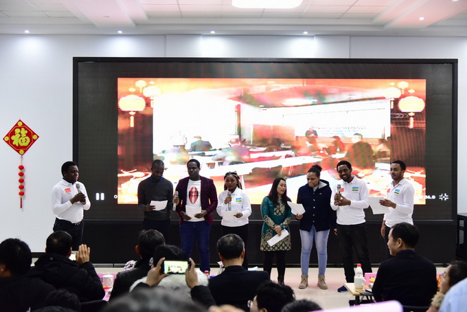 联欢会由王丽琨、孟得媛、要家威、杜明硕四位师生组成,青春靓丽的主持人一亮相就得到了满堂掌声。他们用或热情洋溢,或诙谐幽默的串场词为整场联欢会增光添彩,现场气氛热烈。开始一首合唱《我和我的祖国》点燃了大家的热情,大家都跟着音乐一起合唱,唱出对祖国的热爱与祝福。紧接着的配乐诗歌朗诵《新年你好》更是给大家带来了新年的祝福。歌曲《小幸运》更是掀起了一阵高潮,大家挥舞荧光棒,享受这欢聚一堂的幸运。联欢会中为观众带来欢乐最多的要属相声《我太难了》和小品《毕业论文离奇事件》幽默风趣的语言、诙谐逗趣的表现,让现场的观众掌声笑声不断。留学生的节目也很是出彩,他们的歌曲串烧英文歌曲《queen of my heart》和中文歌《因为刚好遇见你》让我们看到留学生的风采,想必他们在我们中心也体会到家一样的温暖。此外歌曲《天天向上》、《我和2035有个约》、《我们都是追梦人》都展现了青年一代的责任和抱负,展现祖国的未来由我们来创造的决心。配乐诗朗诵《相信未来》和《祖国,我亲爱的祖国》表达了对未来的期望和对祖国的热爱。学生舞蹈《礼仪之邦》将中国传统礼仪运用舞蹈的展现形式展现出来,不仅给我们带来了美的体验更是让我们了解了中国的传统礼仪文化。由中心妇委会带来的蒙古舞《可能否》更是展现了中心职工和学生不一样的风采。精彩的武术表演《武动青春》与诙谐的表演相结合,燃爆全场,让观众体验到传统武术的那份魅力。此次联欢会还设有两个游戏环节,现场观众积极参加,配合默契,体会到游戏的乐趣。
